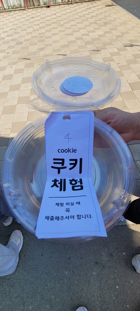 저는 네이버 예약으로 예약했는데 편리하더라구요. 위에 보이는 건물에 들어가시면 아래와 같이 1인당 플라스틱 통 하나씩을 줍니다. 그리고 저희는 쿠키체험도 신청을 해서 아래와 같이 종이를 하나 받았습니다. 이 종이는 나중에 쿠키체험할 때 내시면 됩니다.