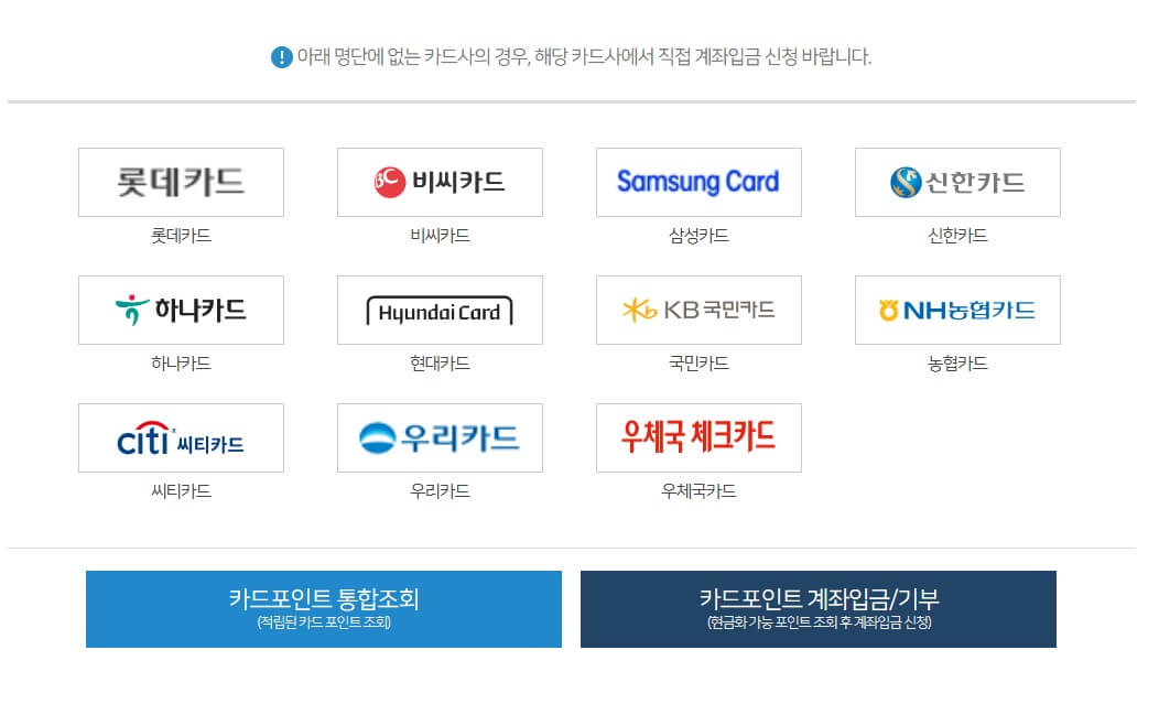 1. 먼저 위 링크를 걸어드린 사이트로 이동을 하면 아래와 같은 화면이 나옵니다. 여기에서 카드포인트 통합조회, 계좌입금, 기부를 선택하시면 됩니다.
