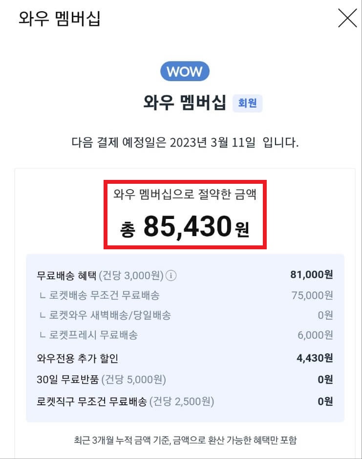 아래 왼쪽에 보이는 캡처사진이 제가 최근 3개월 동안 와우 멤버십으로 절약한 금액입니다.